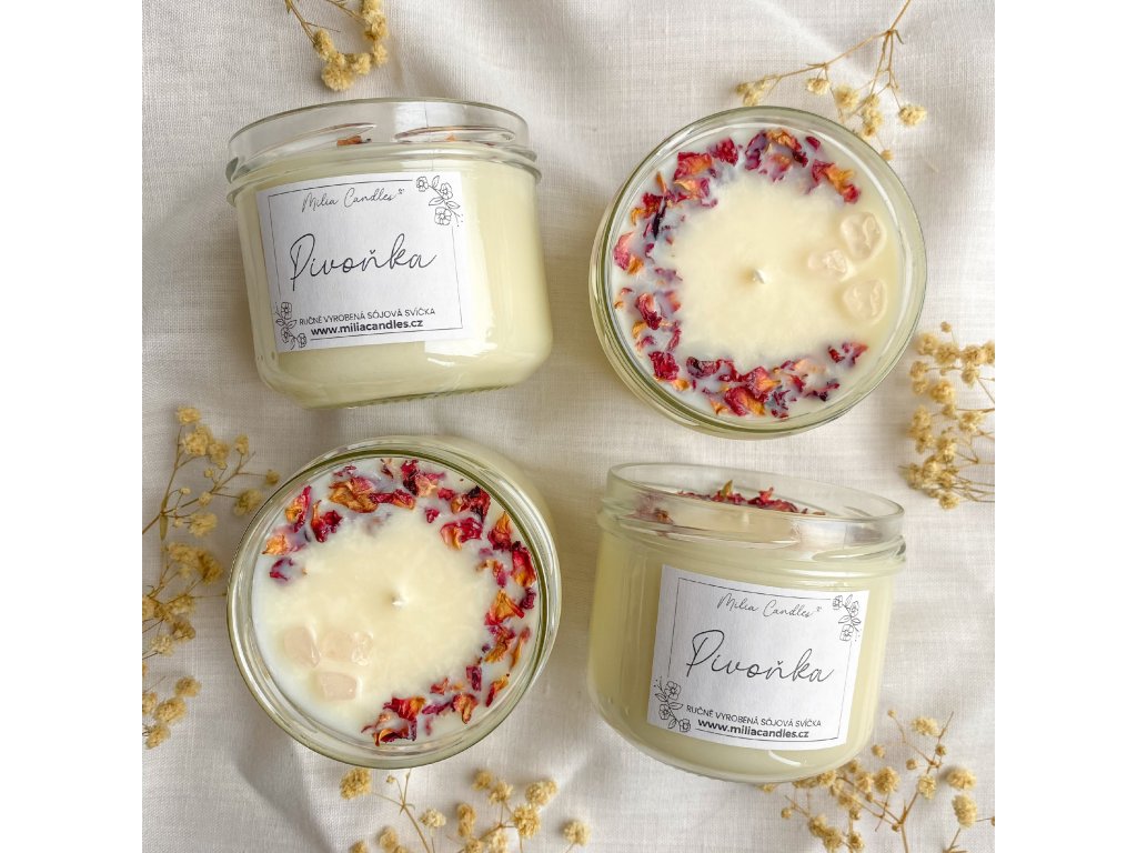 Složení: nádoba ze skla; sójový vosk Kerasoy Container 4130; sójový vosk Pillar 4120; 1x bavlněný knot s plíškem; vonné oleje s certifikací IFRA a REACH; lístky růží; kameny