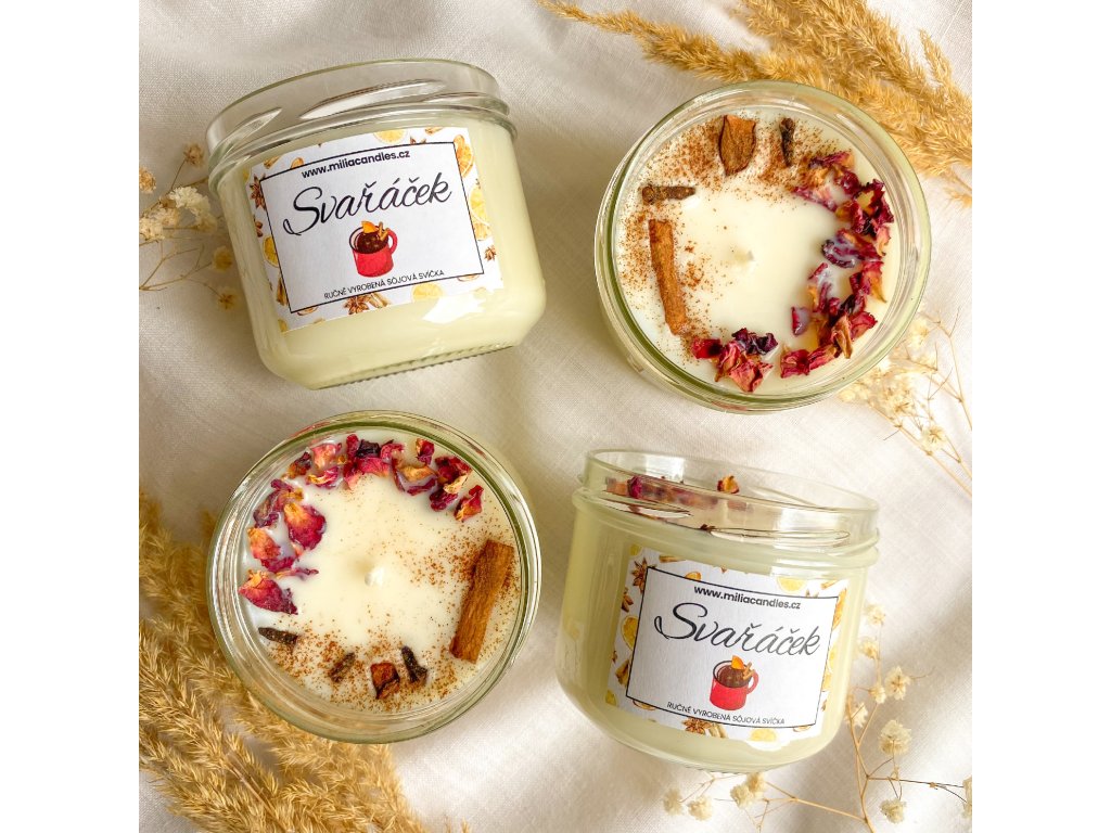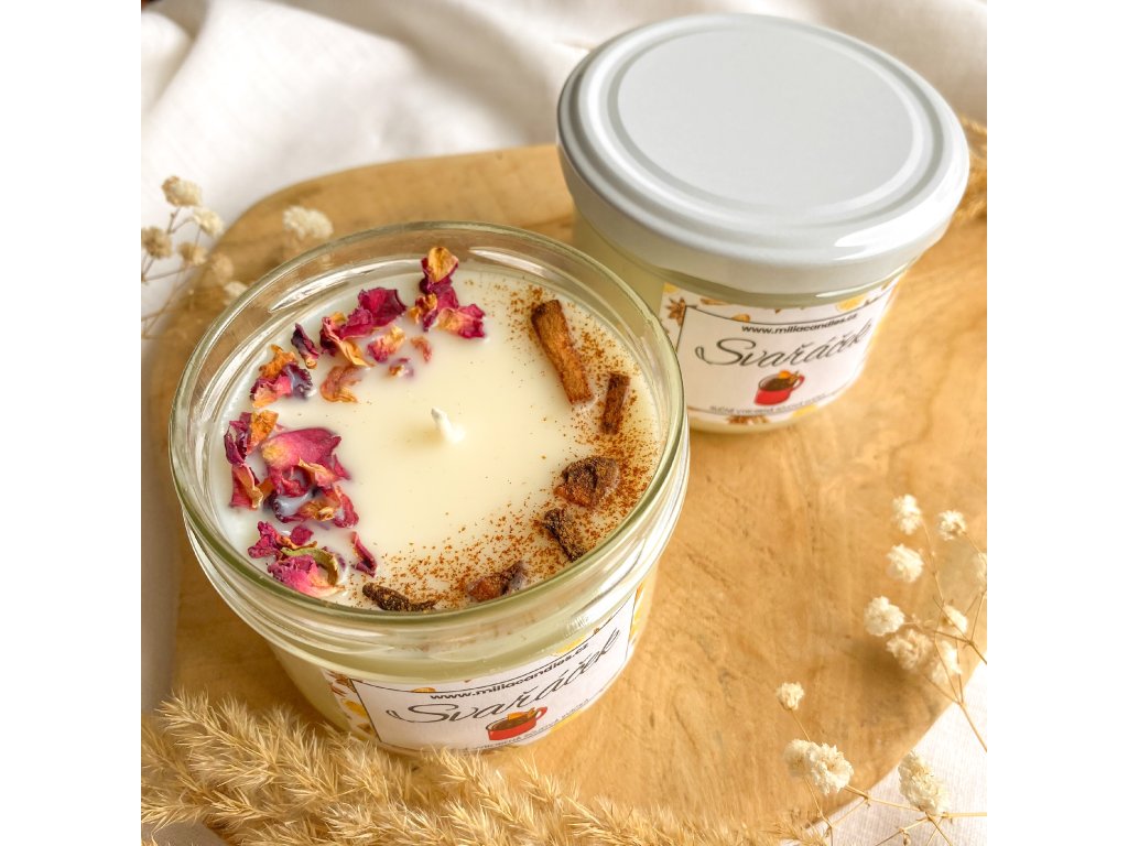 Složení: Skleněná nádoba s víčkem, sojový vosk Kerasoy Container 4130, bavlněný knot, vůně - svařené víno; skořice, badyán, hřebíček, lístky růží