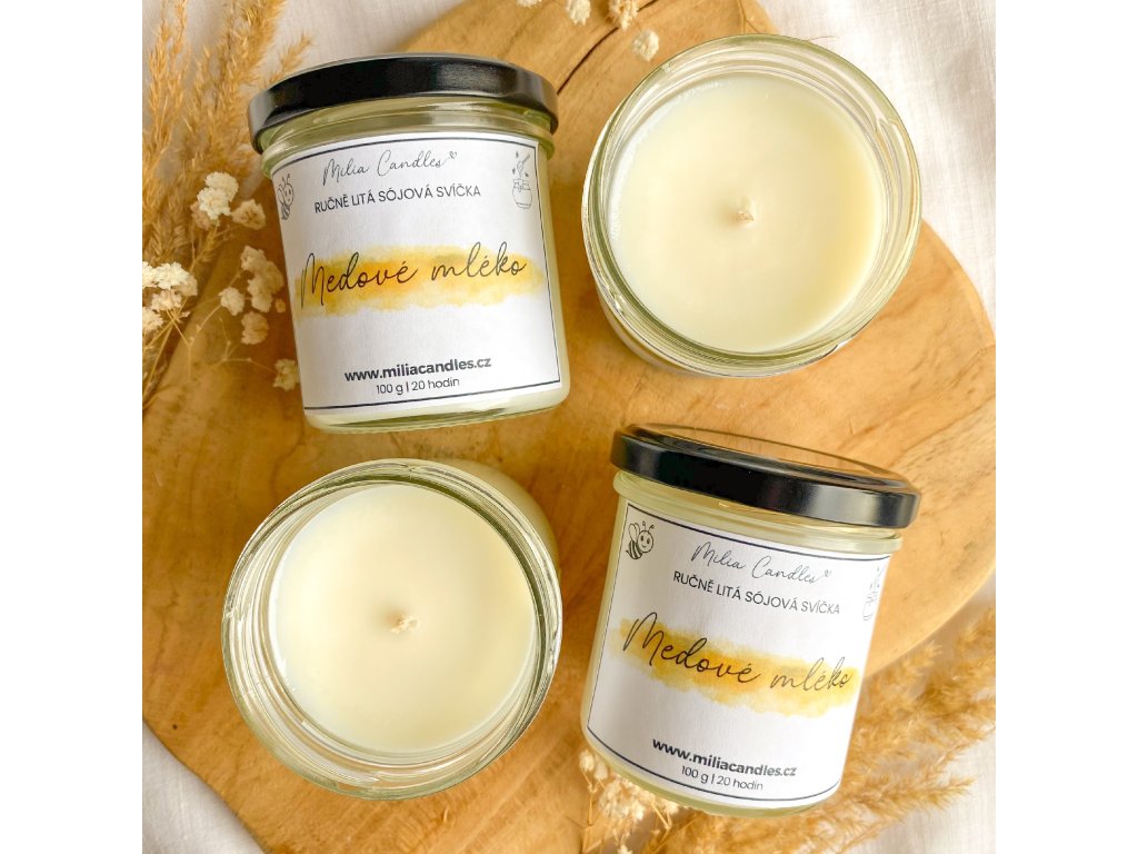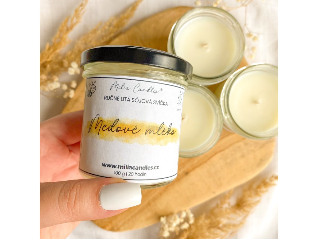 Složení: Skleněná nádoba s víčkem, sojový vosk Kerasoy Container 4130, bavlněný knot, vůně - medové mléko
