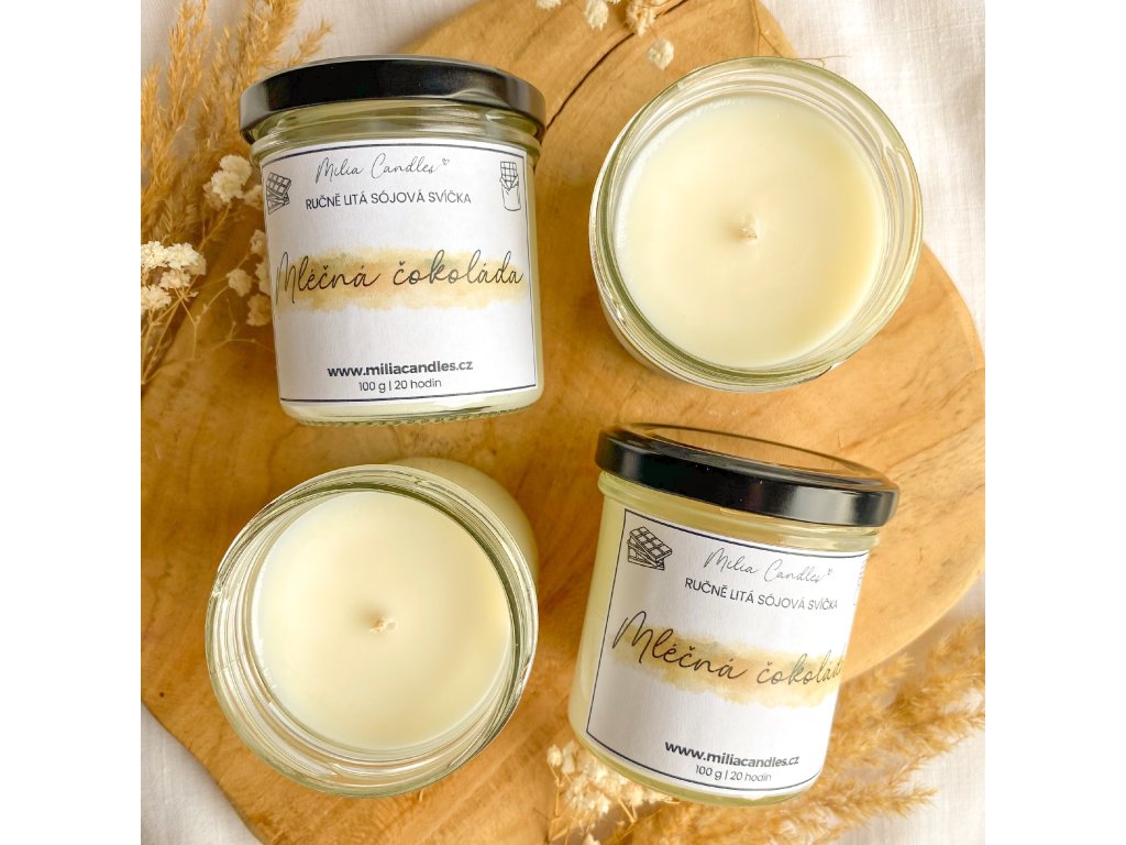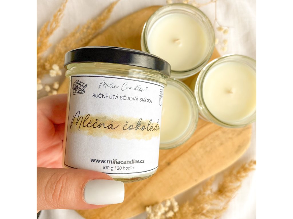 Složení: Skleněná nádoba s víčkem, sojový vosk Kerasoy Container 4130, bavlněný knot, vůně - mléčná čokoláda