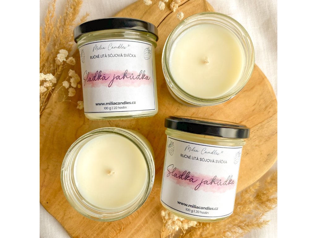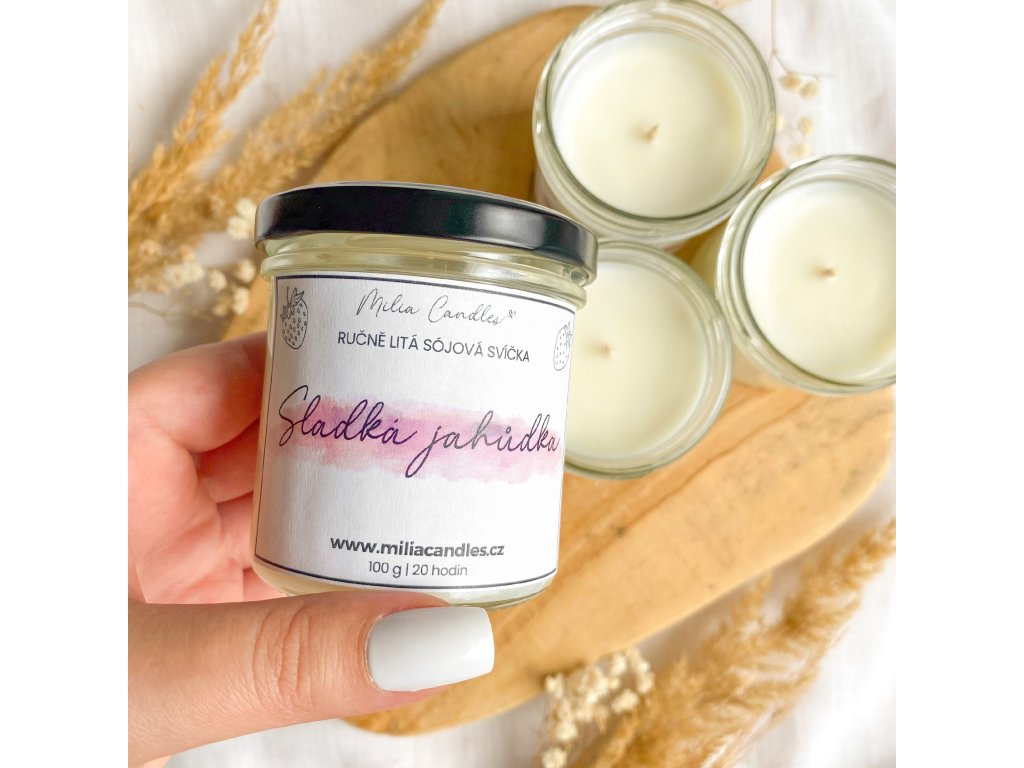Složení: Skleněná nádoba s víčkem, sojový vosk Kerasoy Container 4130, bavlněný knot, vůně - sladká jahůdka
